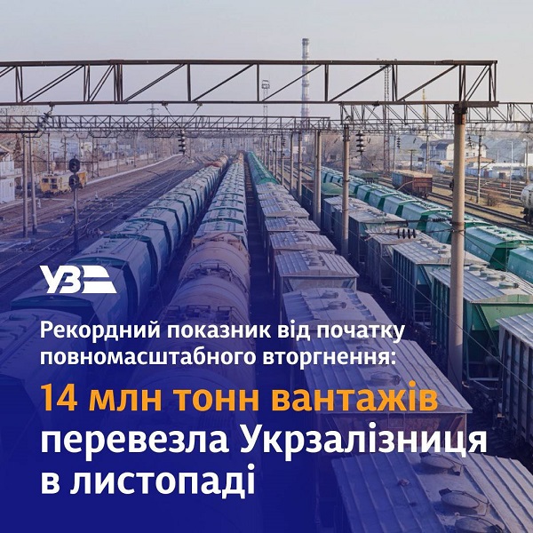Укрзалізниця в листопаді перевезла рекордну кількість вантажів від початку широкомасштабного вторгнення, – Євген Лященко Укрзалізниця в листопаді 2023 року, за оперативними даними, перевезла 14 млн тонн вантажів, що на 33,8% більше аналогічного періоду 2022 року та на 4% більше жовтня 2023 року. Це рекордний показник від початку широкомасштабного вторгнення. Ріст показників зафіксовано за всіма видами сполучення.